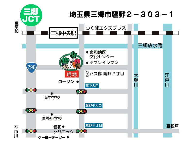 農園前はバス停。つくばエクスプレスを使うと都心から30分程度のアクセスの三郷中央駅。その他JR三郷・金町・松戸駅利用可。